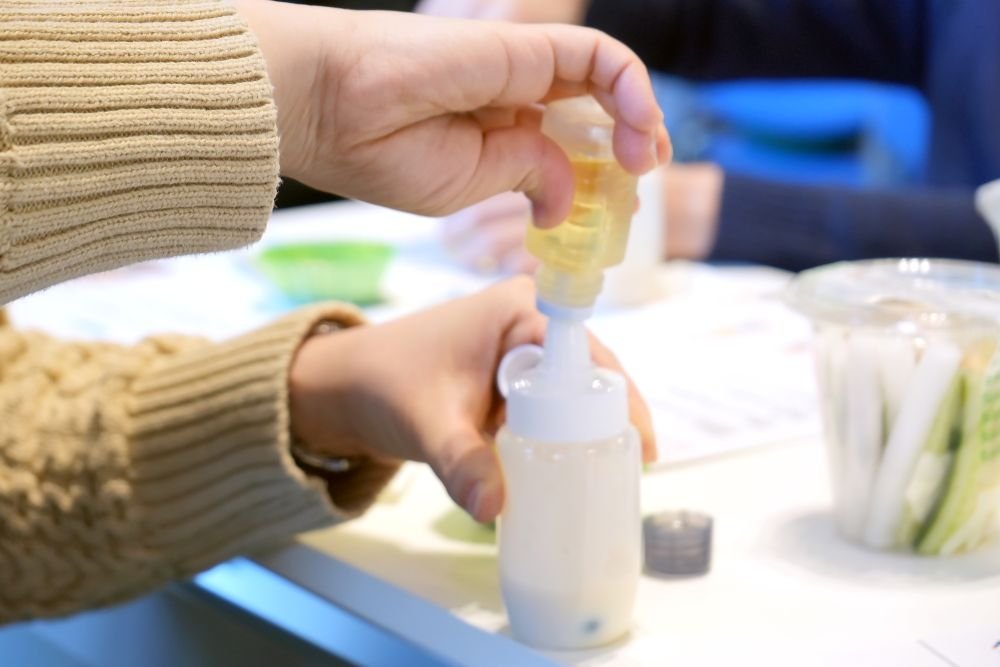 午前と午後の2回に分けて開催された「weeeat!オリジナル豆乳マヨネーズ作り体験」。1回につき最大15組ほど用意された参加枠は、トークライブの効果もあってほぼ満席に。体験材料として参加者に配られたのはこちらの3点です。